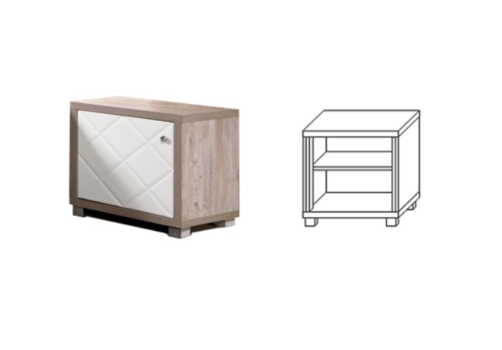 Тумба может быть собрана как левостороння, так и правосторонняя (дверь может быть навешена на правую боковую стенку или на левую). Тумба установлена на четырёх нерегулируемых опорах. Петли без доводчиков, задняя стенка изготовлена из ХДФ. Дверь изготовлена из МДФ плёночного с эффектом Soft-touch. За дверями съёмная полка.